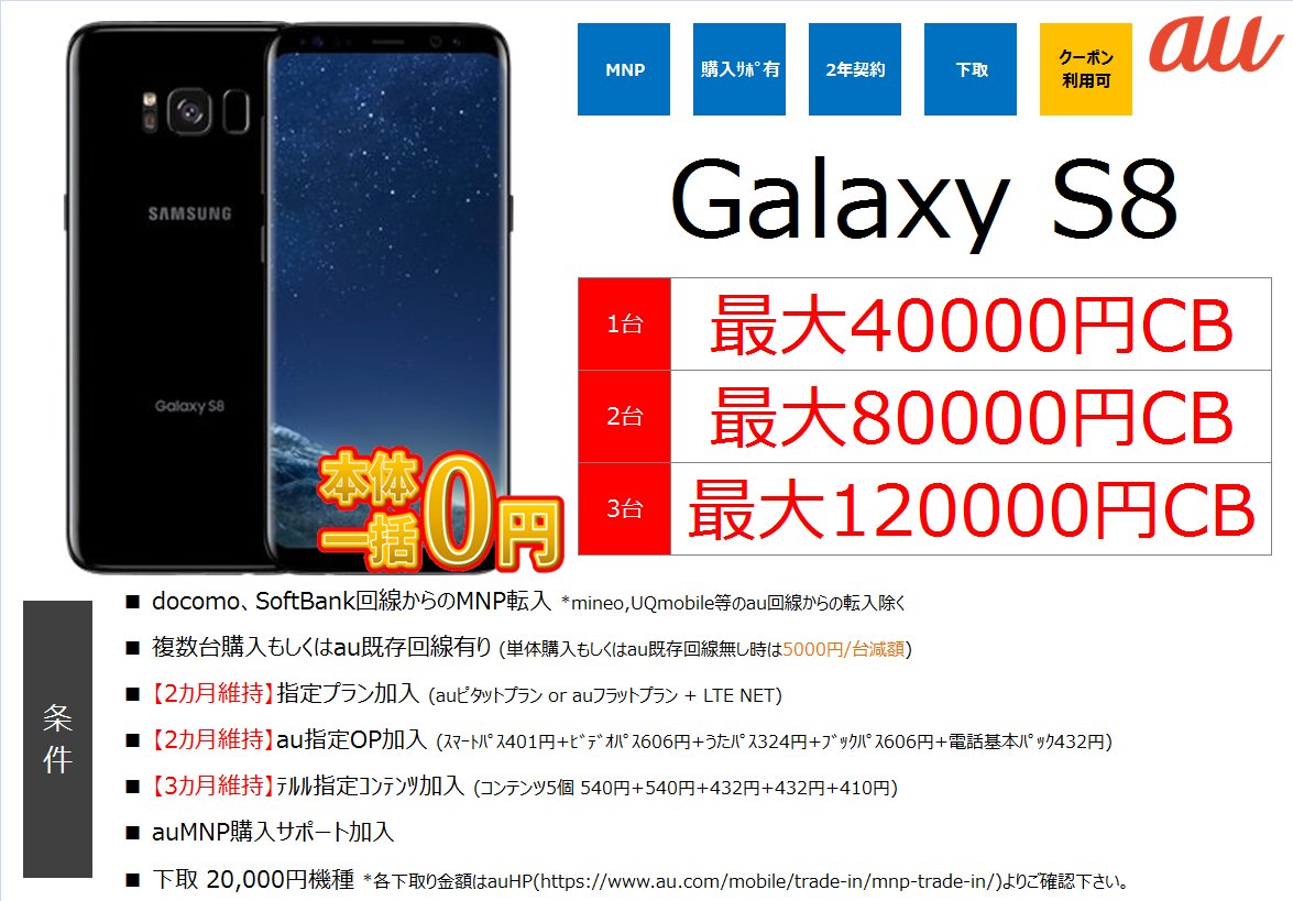 au GaalxyS8 がMNP一括0円+CB4万円!